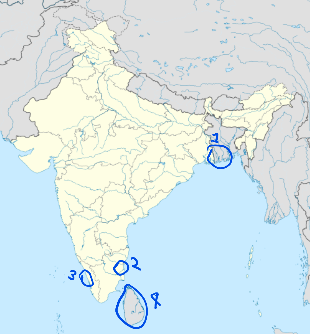 - The river Ganges, draining into what is today the Bay of Bengal.