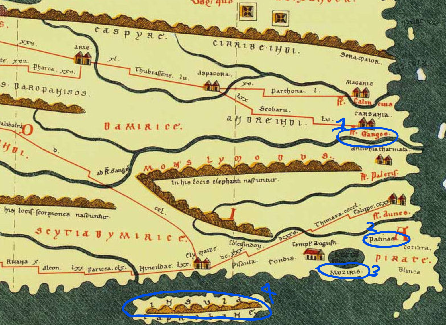 - Insula Taprobane: Believed to be what the Romans called Sri Lanka. It's incorrectly placed to the west of India, near Kerala, while it should have been more towards the east near Tamil Nadu.